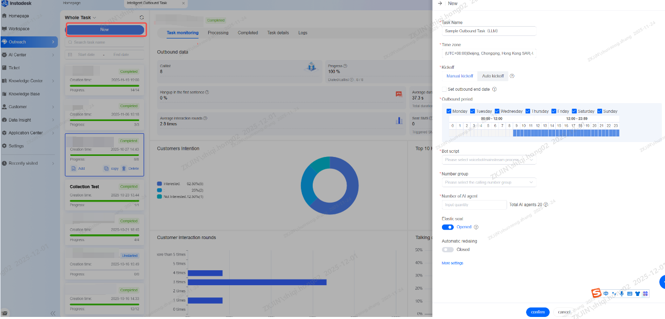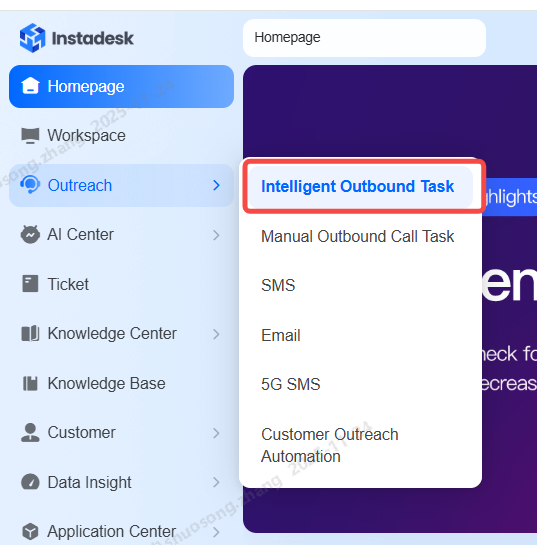 When you need to use a pre-configured outbound bot (NLP or LLM) for bulk calling, you must create an Intelligent Outbound Task. Navigate to Outreach > Intelligent Outbound Task