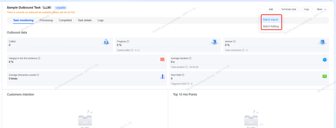 Click Batch Adding to manually enter customer names, phone numbers, and other required variables. This is typically used for small-scale test tasks.