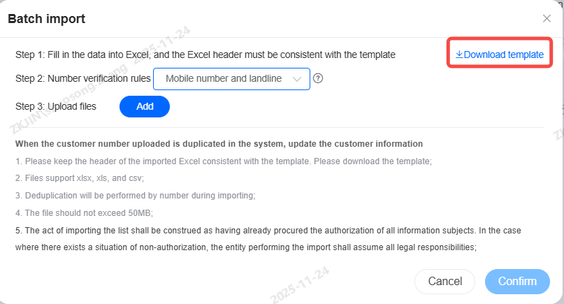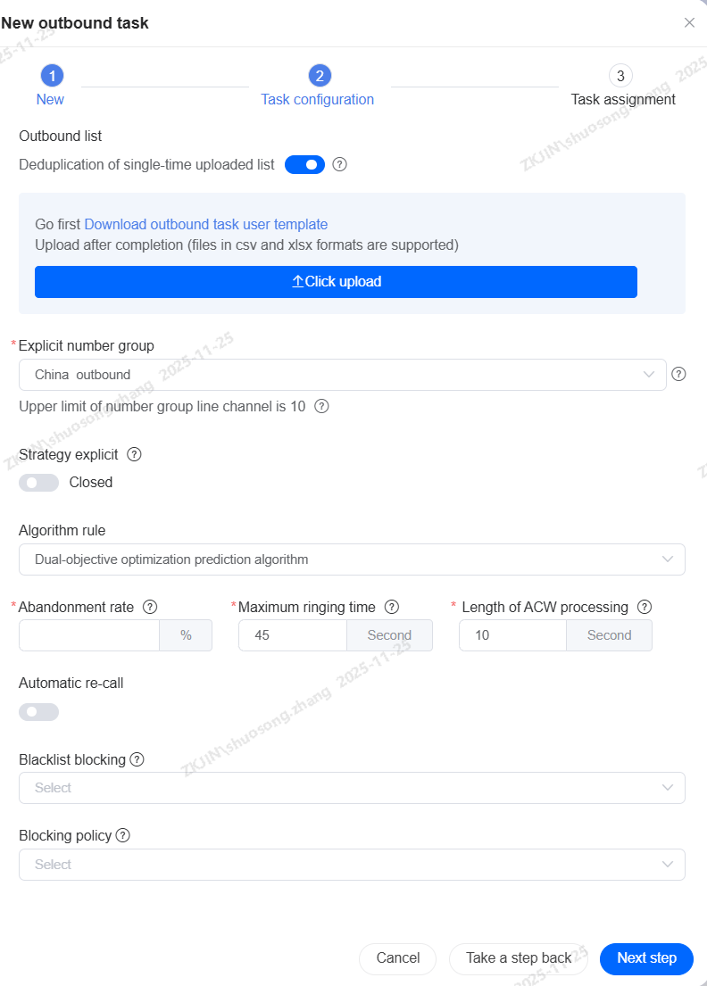 Next, upload the customer list for the task (you can use the template provided by the system)