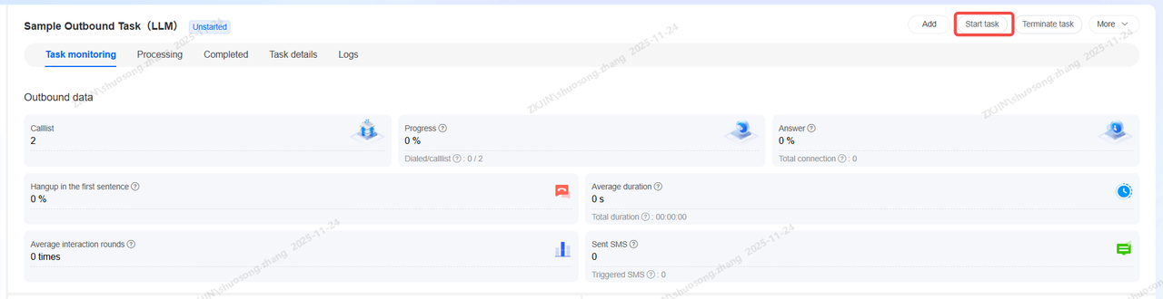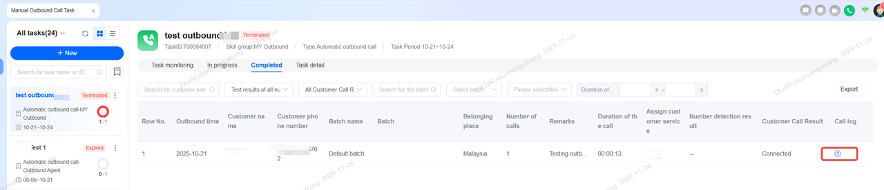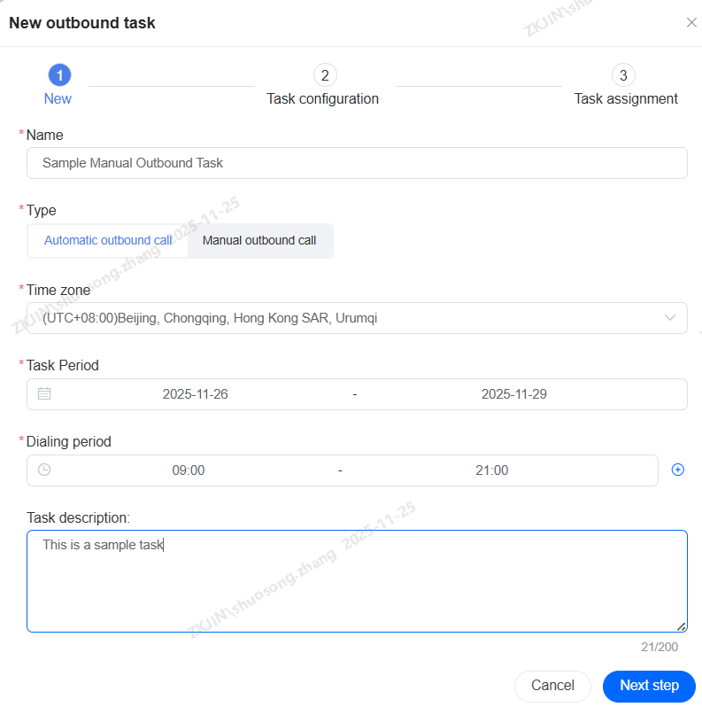 Note: The number group selected in the previous step must be bound to a valid outbound number. Otherwise, the manual outbound task cannot be launched.