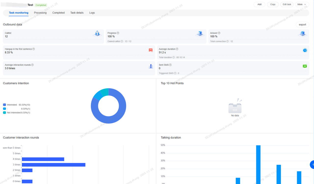 Once an outbound task ends, you can select it from the Intelligent Outbound Task interface to view its overall performance data.