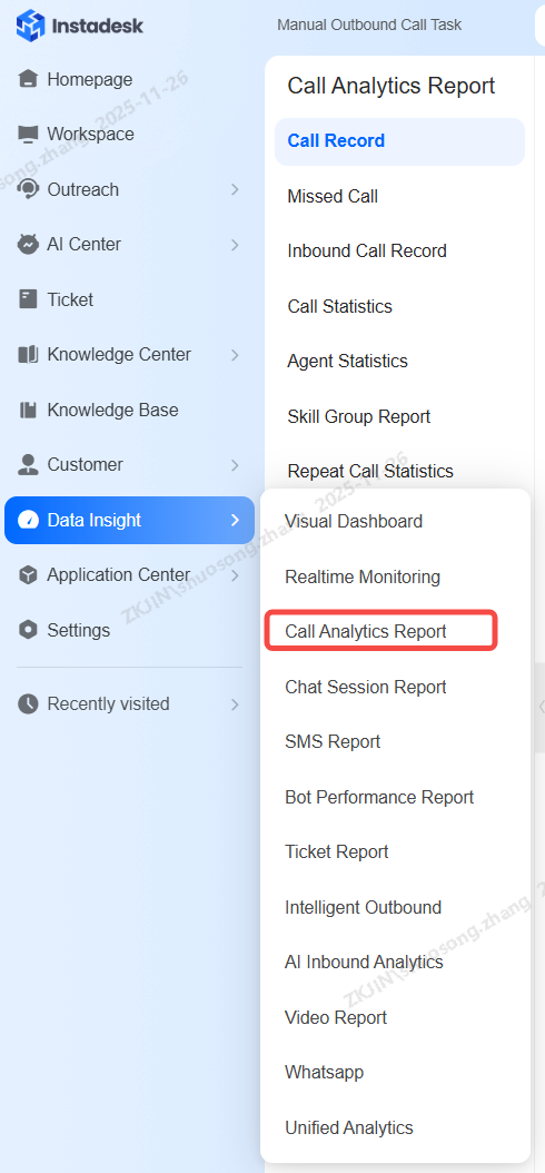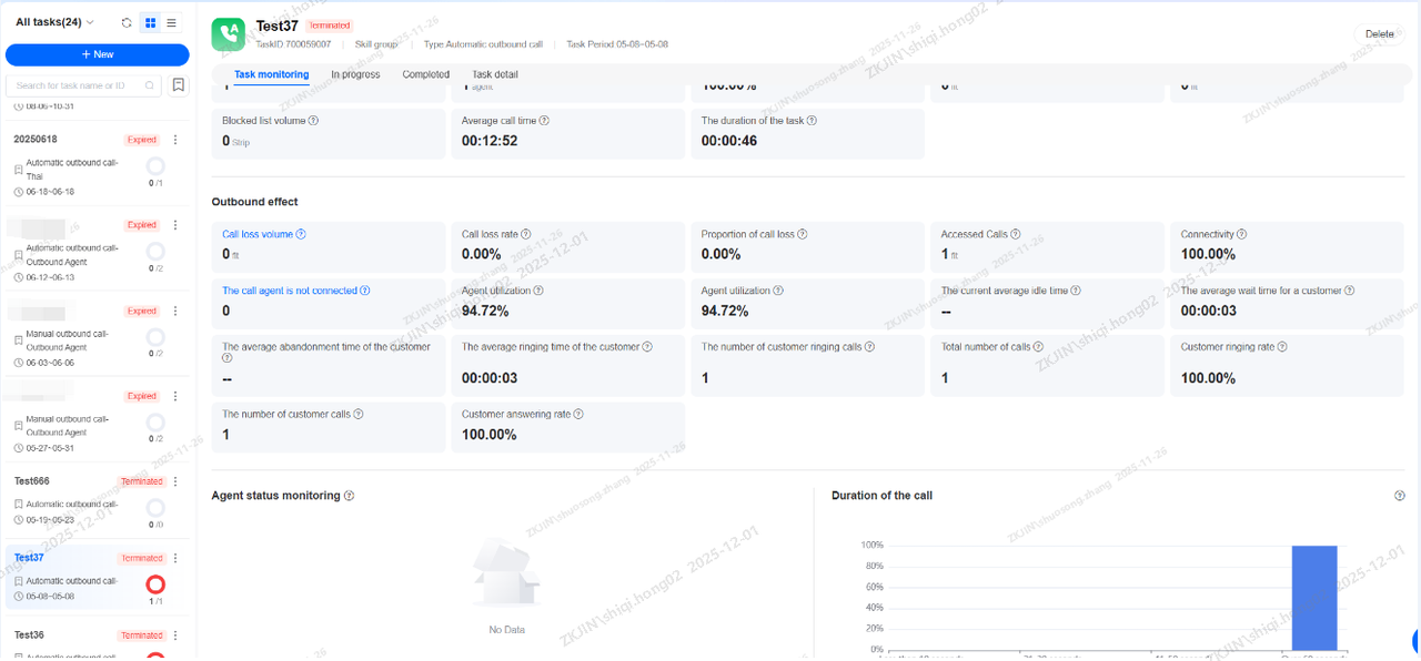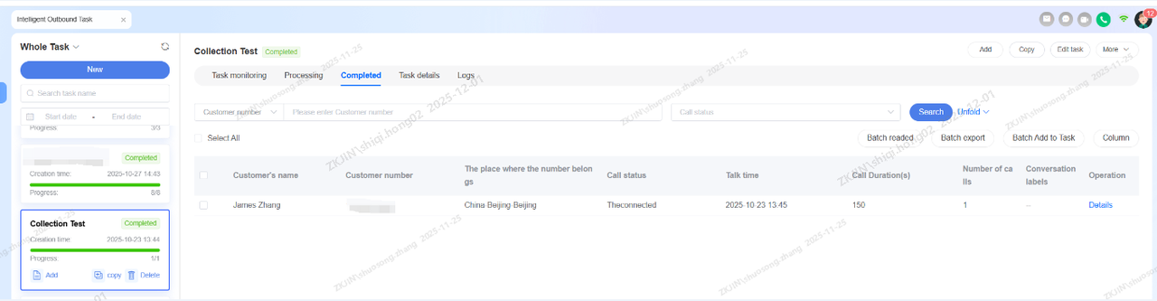 After an outbound task is assigned and completed, team managers typically need to view its specific details and performances. This can be done in the system's Data Insight module