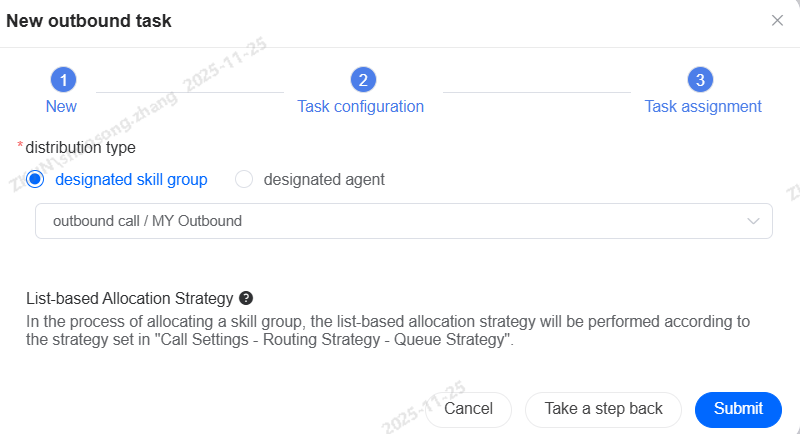By configuring a series of manual outbound tasks, you can finally launch the task. Before launching, you must select the assigned skill group or agent and click Submit to begin.