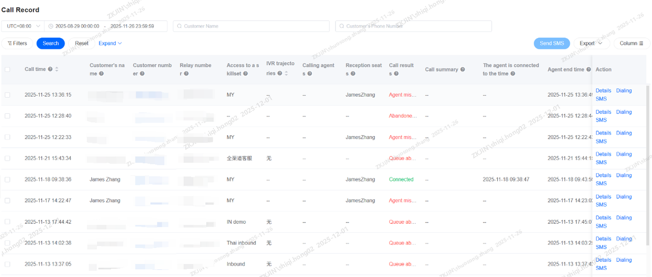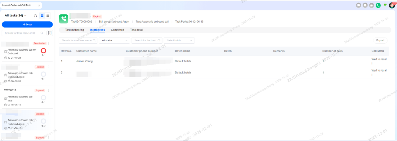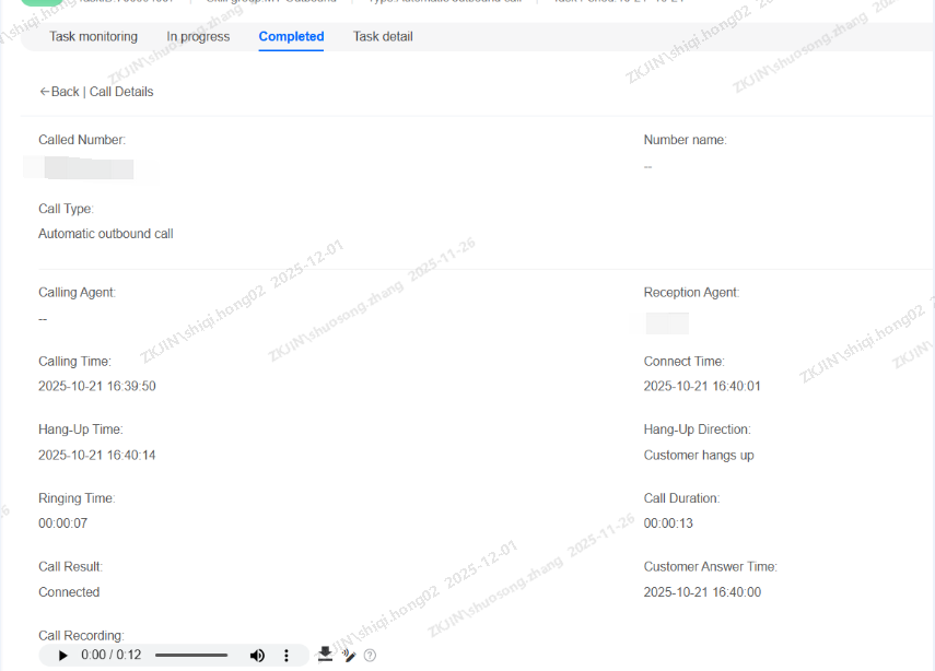 During the outbound task, you can monitor the active calls in real-time by clicking the In Progress tab and view the completed call results (Includes audio recording).