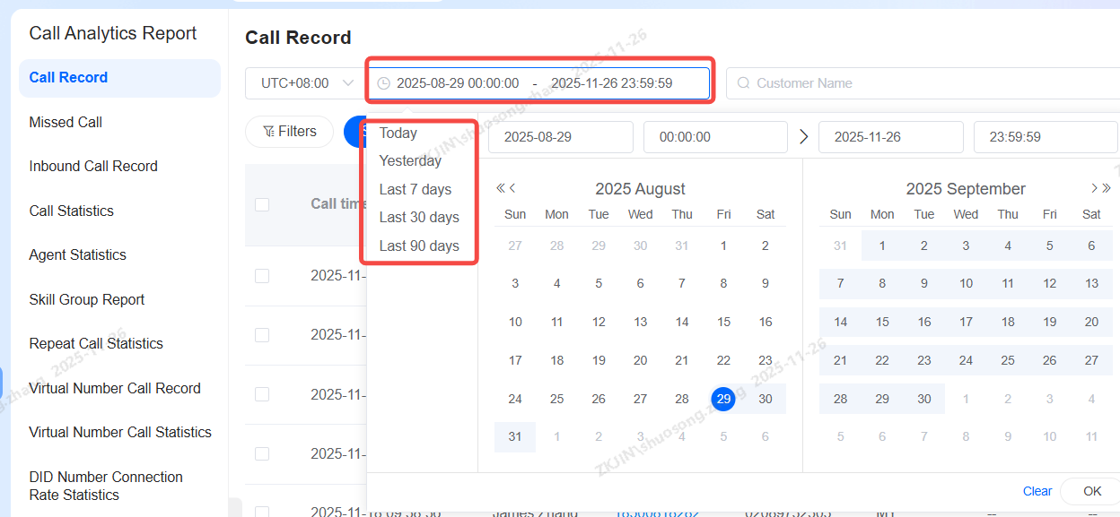 Select the appropriate time period to view the associated records, call recordings, and transcripts.