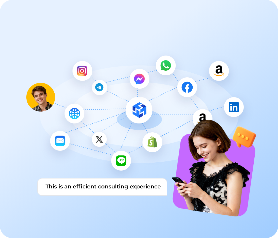 Liputan menyeluruh titik sentuhan pelanggan, memastikan tiada pertanyaan pelanggan terlepas, menyokong e-mail, SMS, laman web rasmi, aplikasi, serta WhatsApp, Facebook, Instagram, Line, Amazon, eBay dan sebagainya.
