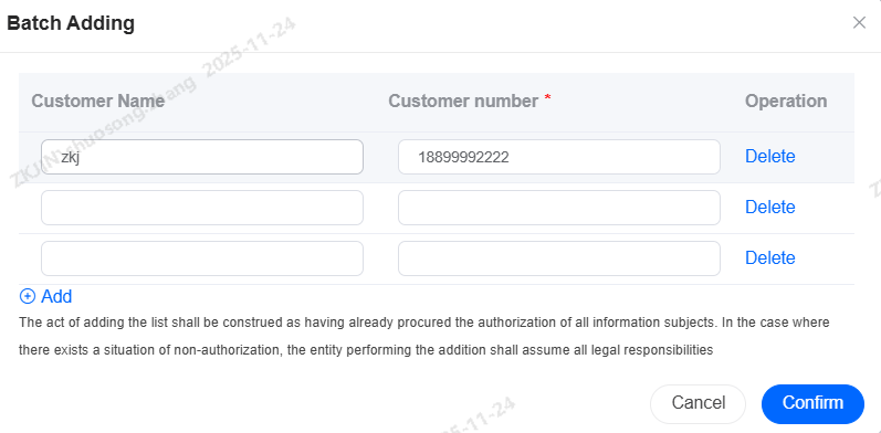 Click Batch Adding to manually enter customer names, phone numbers, and other required variables. This is typically used for small-scale test tasks.
