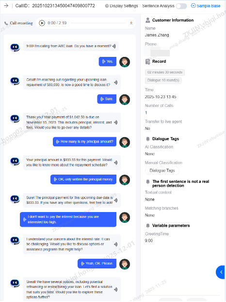 During the outbound task, you can monitor the active calls in real-time by clicking the In Progress tab and view the completed call results (Includes audio recording).