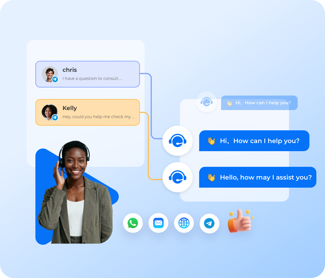 Liputan menyeluruh titik sentuhan pelanggan, memastikan tiada pertanyaan pelanggan terlepas, menyokong e-mail, SMS, laman web rasmi, aplikasi, serta WhatsApp, Facebook, Instagram, Line, Amazon, eBay dan sebagainya.