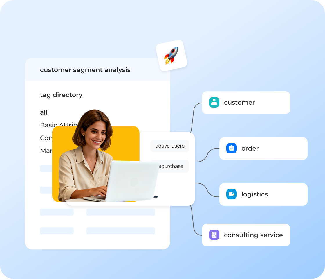 Mengintegrasikan secara lancar dengan sistem perniagaan seperti CRM/ERP, membolehkan sistem CRM, pesanan dan logistik perusahaan bersambung tanpa jurang dengan platform Instadesk.Wakil khidmat pelanggan boleh melihat secara langsung maklumat pelanggan, maklumat pesanan, portal pertanyaan dan lain-lain tanpa perlu bertukar sistem.Ini menyediakan perkhidmatan yang lebih tepat dan cekap, meningkatkan kecekapan sebanyak 30%, meningkatkan kepuasan pelanggan sebanyak 20% serta memberikan pengalaman pelanggan yang lebih difahami.