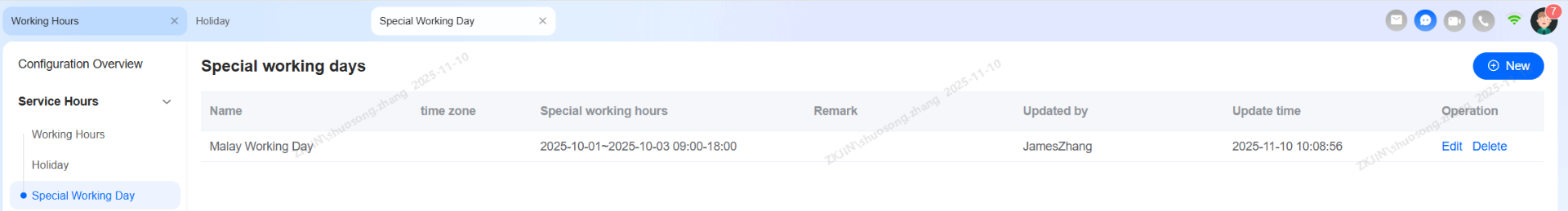 After the initial system setup, the administrator must configure the service hours based on the location and operational schedule of the customer service team. Navigate to Configuration Overview > Service Hours