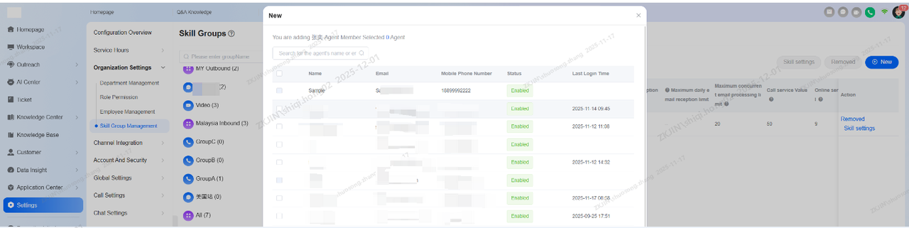 You can add or edit skill groups. In the pop-up window, edit the skill group's name and select the capabilities it will possess (e.g., call center, online chat, tickets). Once capabilities are selected, the skill group can be assigned to corresponding business workflows.