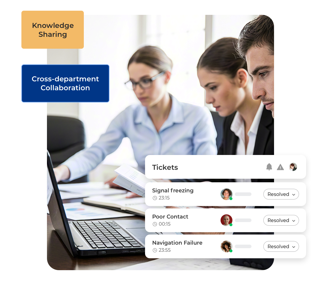 เมื่อจัดการงานข้ามหน่วยงาน เจ้าหน้าที่สามารถ @ เพื่อนร่วมงาน แชร์ไฟล์ อัปเดตสถานะในทิกเก็ตเดียวกัน และเข้าถึงฐานความรู้นโยบายที่เป็นปัจจุบันได้ตลอดเวลา ช่วยให้ข้อมูลถูกต้องสอดคล้อง และเพิ่มประสิทธิภาพในการตัดสินใจร่วมกัน"