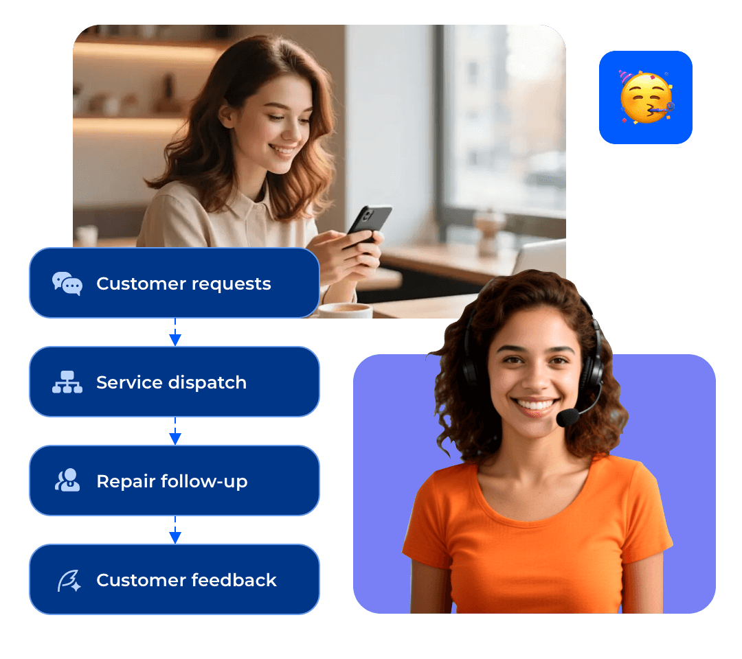 จัดการกระบวนการทั้งหมดแบบอัตโนมัติ ตั้งแต่คำขอของลูกค้า การจัดทีมบริการ การติดตามการซ่อม ไปจนถึงการรับฟีดแบ็ก ช่วยเพิ่มความรวดเร็วในการให้บริการ