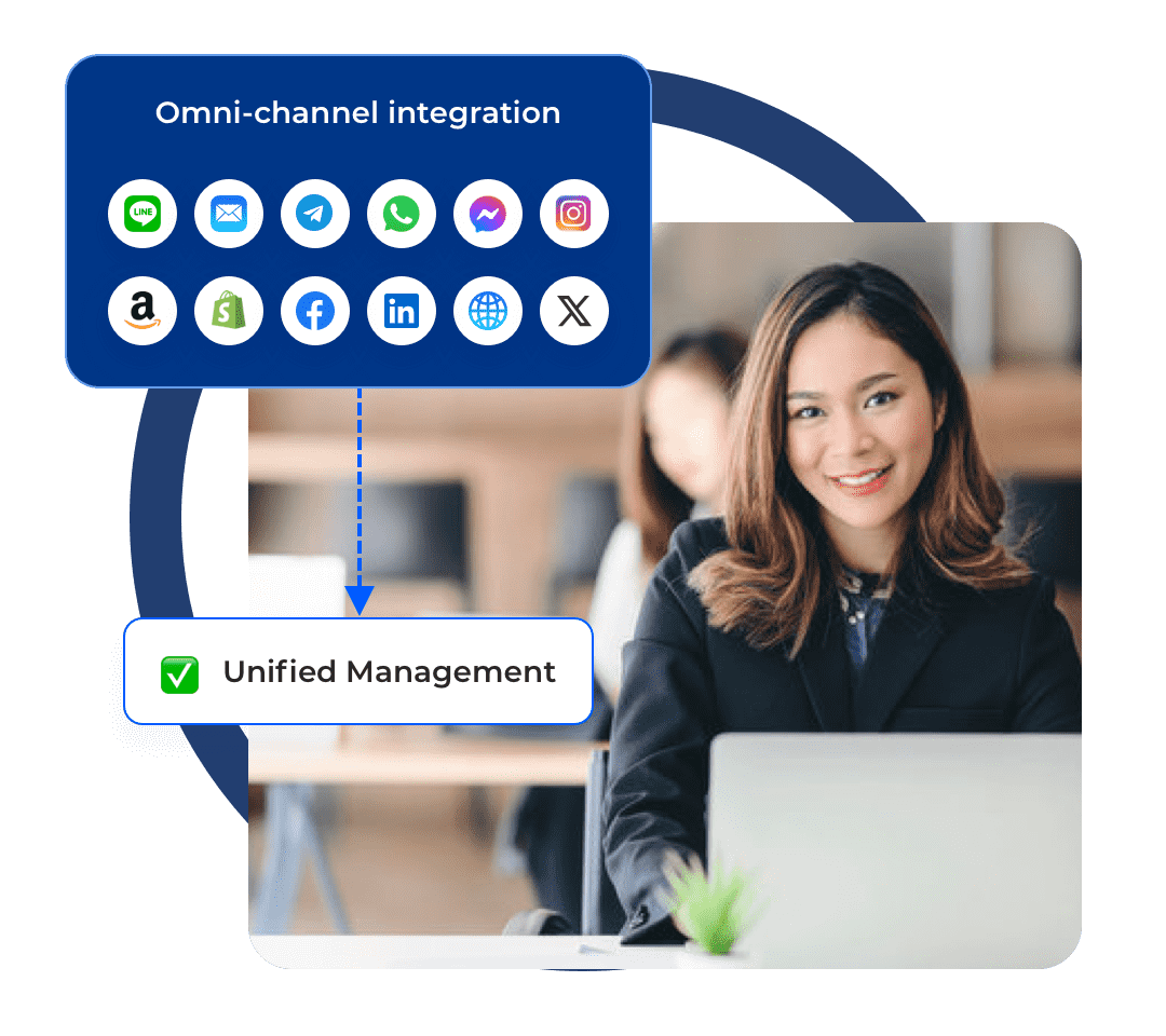 It supports unified management of e-commerce platforms (Amazon Shopee, Shopify, etc.), social media (WhatsApp, Instagram, etc.), email, online chat, etc