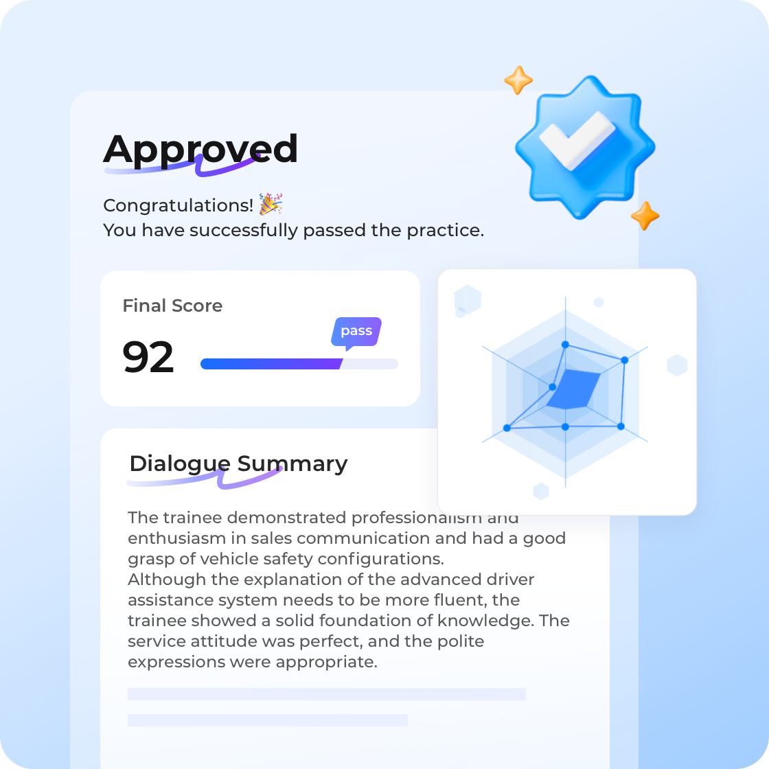 การฝึกอบรมยุคใหม่ด้วยโมเดลขนาดใหญ่ จำลองสถานการณ์จริงแบบ 1 ต่อ 1 พร้อมระบบฝึกอัจฉริยะ ให้ฟีดแบ็กผลการฝึกแบบทันที ช่วยให้พนักงานใหม่ ทีมบริการลูกค้า ฝ่ายขาย และพนักงานอื่น ๆ สามารถเริ่มงานและปิดการขายได้อย่างรวดเร็ว